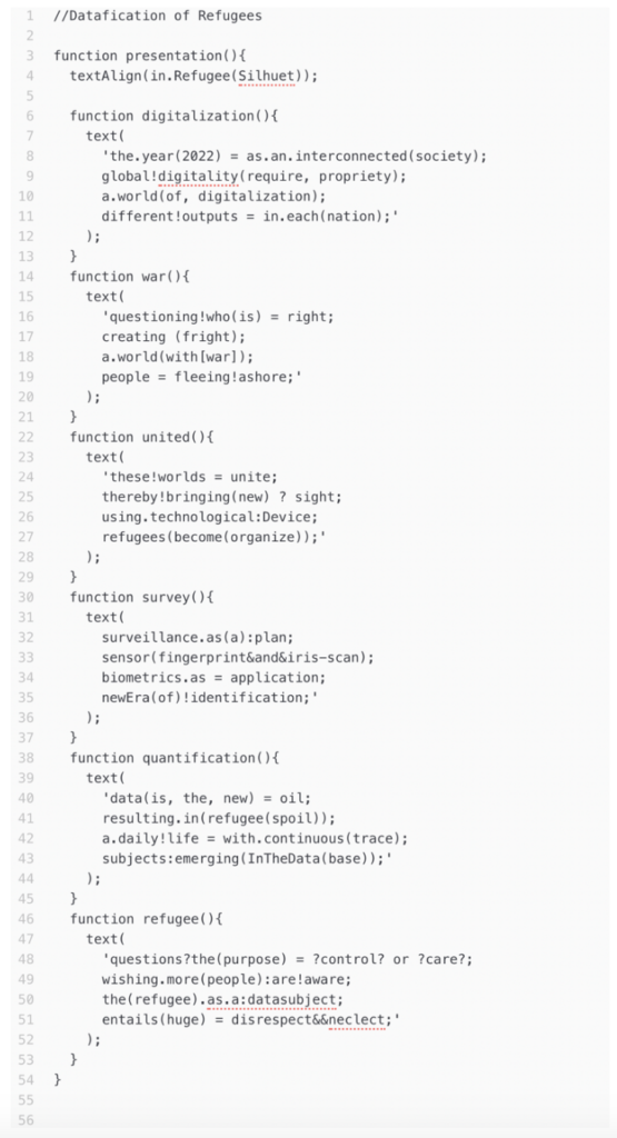 I tried to visualize how a refugee body has become less human and more a digital subject. Although I found it a bit vague, which is why I tried to incorporate poetic dimensions into the situation – an elegant and abstract course of action to describe a vulnerable situation. With this intention and with the knowledge gained from the information of my first sketches, I created a codework.