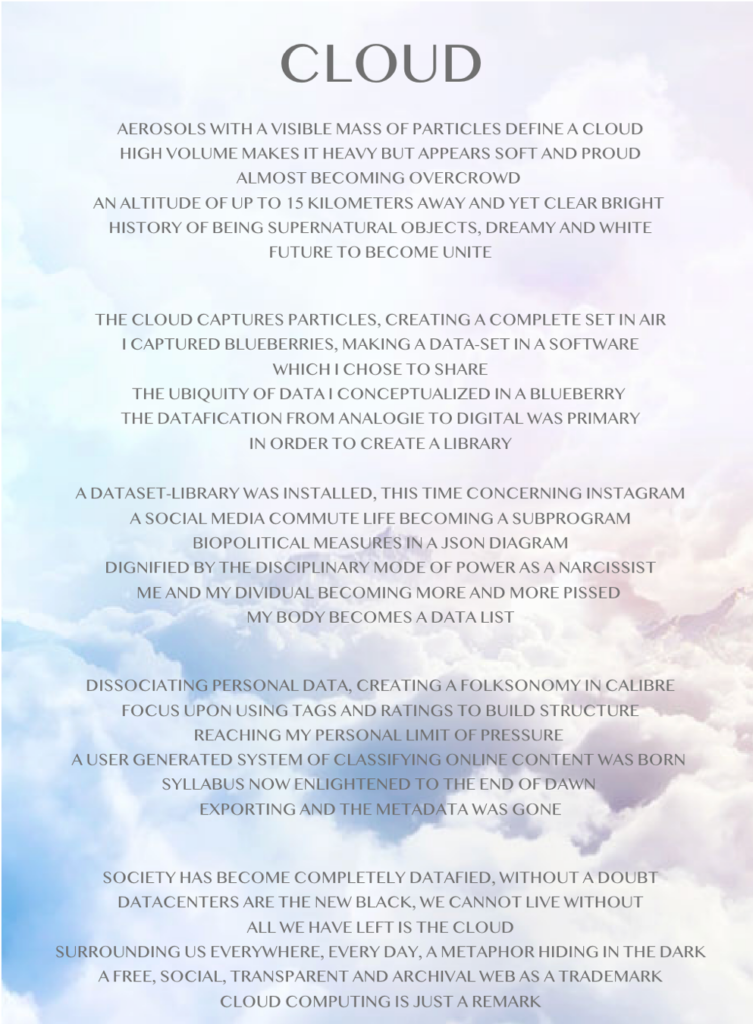 In the course of Critical Data Studies I was introduced to a smaller course called Curating Data. Throughout the course we were assigned four tasks, which concerned (1) making a dataset, (2) making a data selfie, (3) the creation of a folksonomy in Calibre and (4) presenting a curational statement. The last assignment we were asked to bring all of these four elements together in one statement. Here I chose to present the curatorial statement in the shape of an interactive, beautiful and carefree poem concerning clouds, data and the ignorance of datafication.